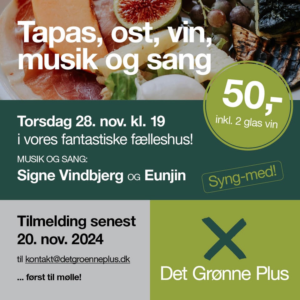 I Det Grønne Plus handler det om fællesskab, og vi vil gerne invitere dig til en særlig aften fyldt med hygge, god mad og skønne toner i vores fantastiske fælleshus. Torsdag d. 28. november kl. 19 åbner vi dørene for en hyggelig aften med tapas, ost, vin og sang. Vi har sørget for alt det gode – lækker tapas, to glas vin og fantastisk musik, alt sammen for kun 50 kr.